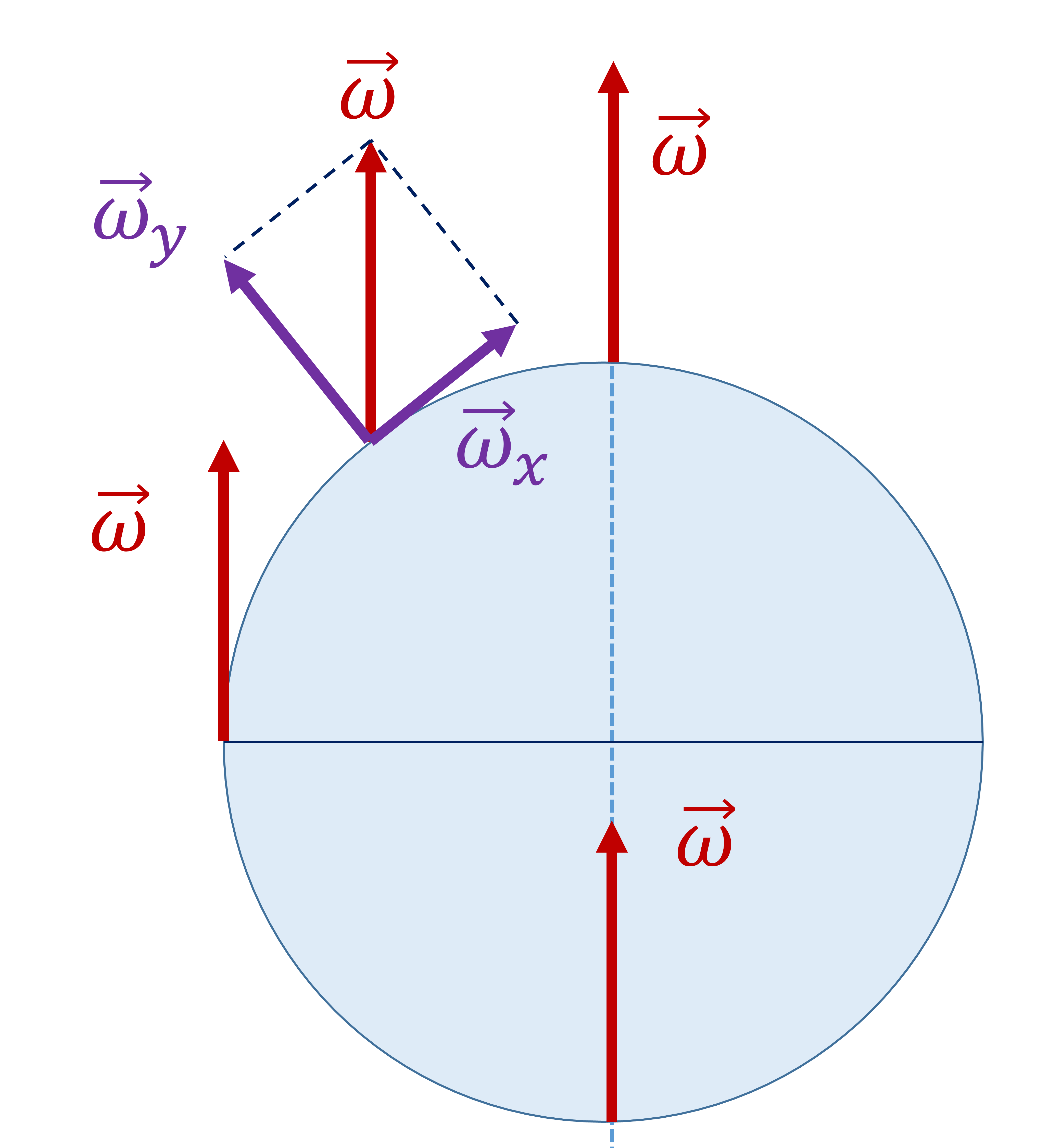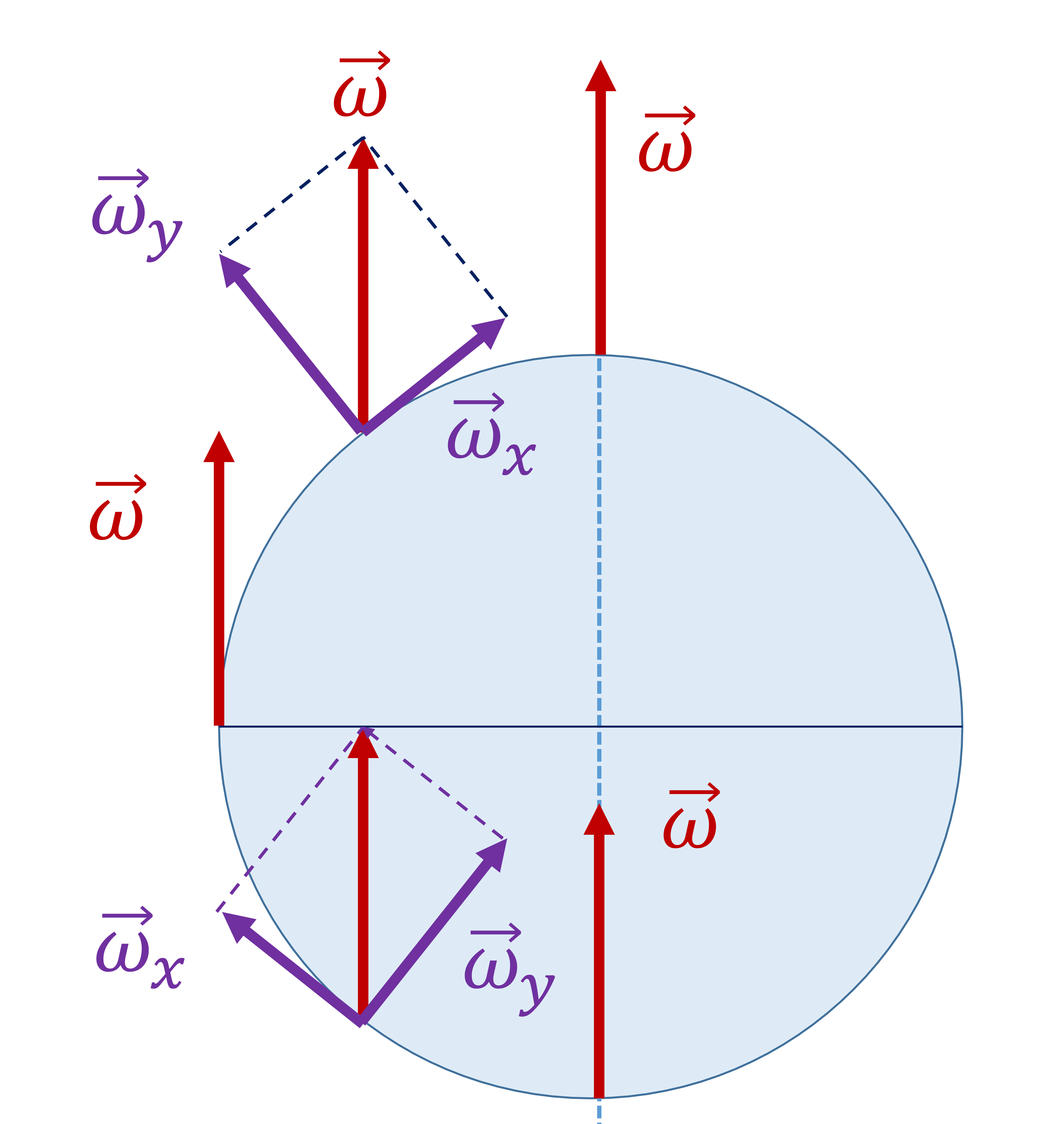 Az \(\vec{\omega}\) szögsebességnek csak az \(\vec{\omega}_y\) függőleges komponense az, ami jobbra illetve balra téríti el a \(\vec{v}_x\) vízszintes sebességkomponenst. Az Egyenlítőn a szögsebesség függőleges komponense valóban nulla, és valóban ellentétes lesz, ha észak felé illetve ha dél felé indulunk. Ugyanis az északi féltekén a szögsebesség függőleges komponense mindig felfelé mutat: