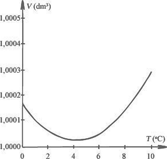 A grafikon $1\ \mathrm{kg}$ víz térfogatát ábrázolja a hőmérséklet függvényében nagy pontosságú mérések szerint.