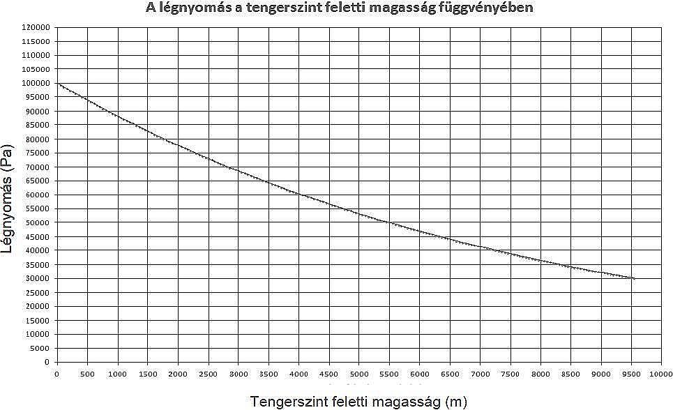 A levegő nyomása a felszín feletti magasság függvényében csökken, így a légnyomás értéke hozzávetőlegesen 5500 méterenként feleződik meg. Az alábbi grafikon mutatja a légnyomást a magasság függvényében, \(100\ 000\ \mathrm{Pa}\) tengerszinten mért nyomást feltételezve.