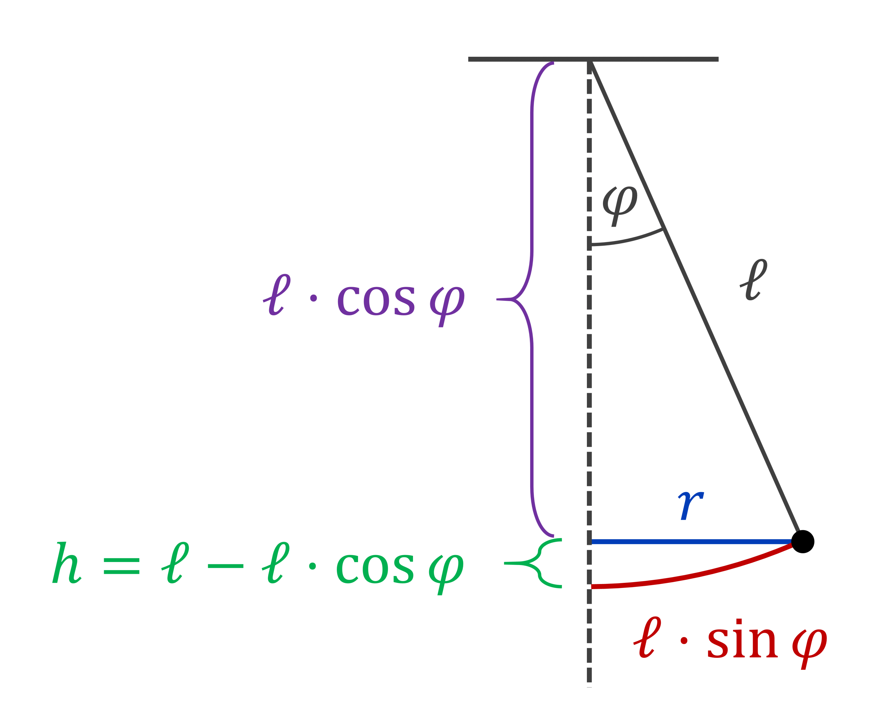 Fejezzül ki \(r\) értékét az inga paramétereivel, vagyis az \(\ell\) hosszával és az inga \(\varphi\) ún. félnyílásszögével (ami az inga drótjának a függőlegessel bezárt szöge)! Kis szögek esetén \(r\) a golyó által bejárt ívhosszal közelíthető: