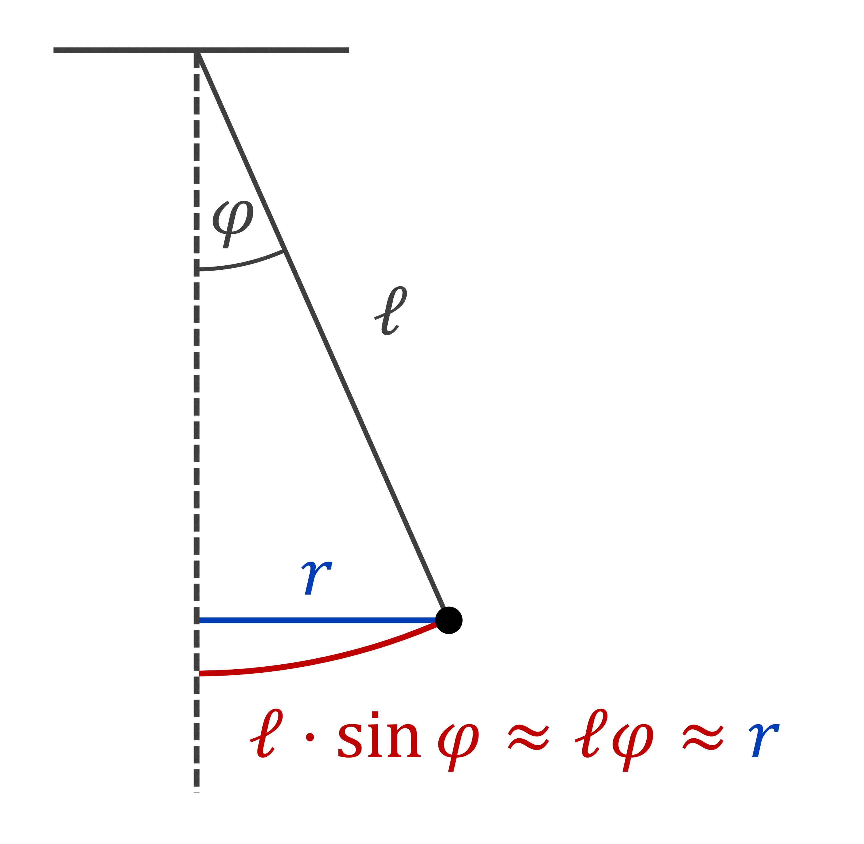 Az általunk rögzített \(r\approx \ell \cdot \sin{\varphi}\) vízszintes amplitúdó kis \(\varphi\) szögek esetén közelíthető a szinuszfüggvény sorfejtése segítségével: