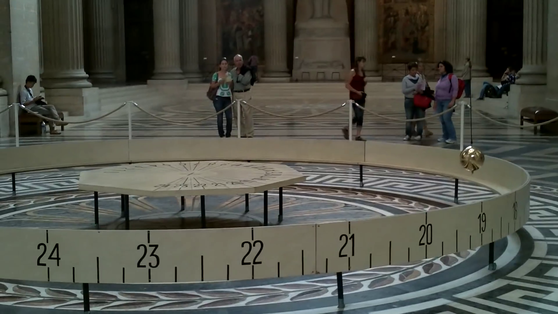 A párizsi Pantheonban például \(\approx3\ \mathrm{m}\) a vízszintes amplitútó, és mivel a lengési sík óránként \(11,3{}^\circ\)-ot fordul körbe, azaz \(1\ \mathrm{perc}\) alatt 60-szor kevesebbet,