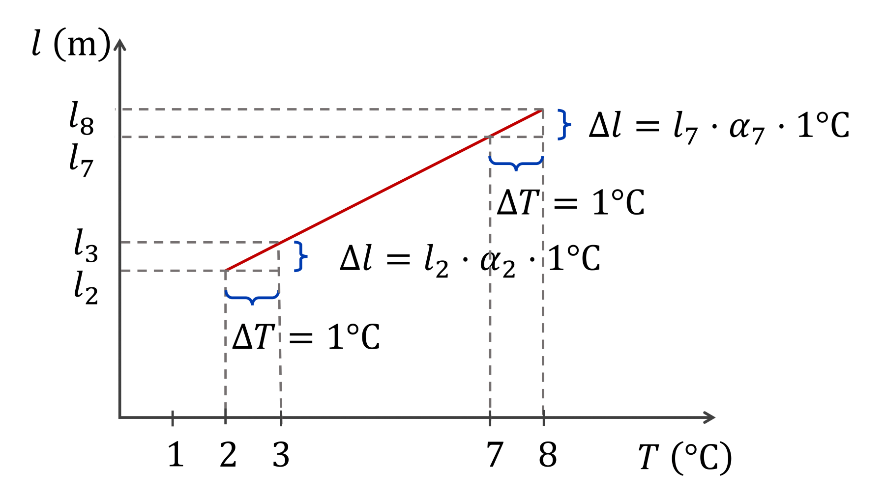 A fenti képen az egyszerűség kedvéért egységnyi hőmérsékletnövekedéssel melegítünk, először \(2\ \mathrm{{}^\circ C}\)-ról, aztán \(7\ \mathrm{{}^\circ C}\)-ról. Mivel a tágulási grafikon egyenes, ezért ugyanakkora jobbra lépésre ugyanakkora felfelé lépésnek kell bekövetkeznie. Mivel a törvény szerint a hosszváltozások