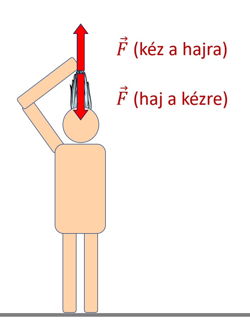 Newton III. törvénye miatt, amikor a keze kifejt egy felfelé irányuló erőt a hajára, akkor fog ébredni egy ellenerő is, amit a haja fejt ki a kezére, és ez lefelé irányuló, de az előbbivel azonos nagyságú lesz.