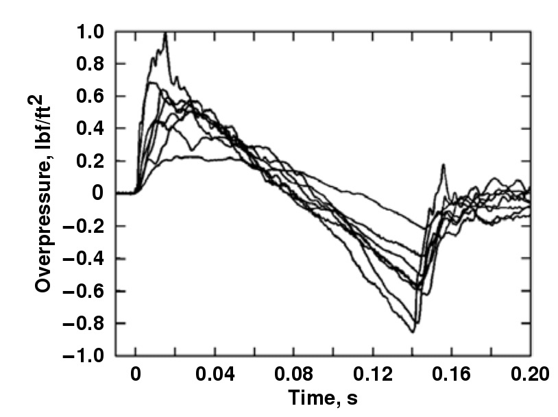A függvény alakja miatt ezt a jelenséget N-hullámnak hívjuk. A nyomásnövekedés mértéke jellemzően pár száz pascal, a legnagyobb mért érték \(7000\ \mathrm{Pa}\) volt, ami nagyon erős hangnak számít; ez már betörheti az épületek ablakait.