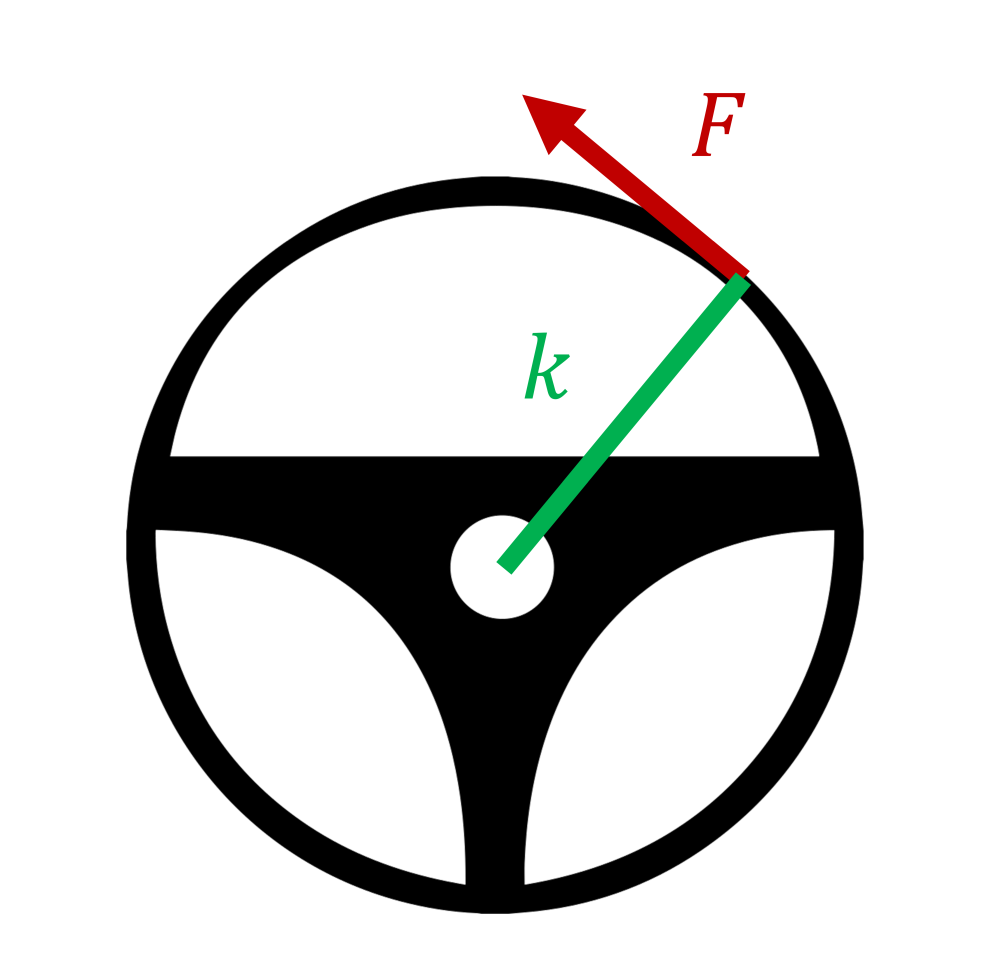 vagyis az \(F\) erő és a \(k\) erőkar szorzata. Az erőkar (az erő egyeneségnek, hatásvonalának távolsága a forgástengelytől) itt a kormánykerék sugara: