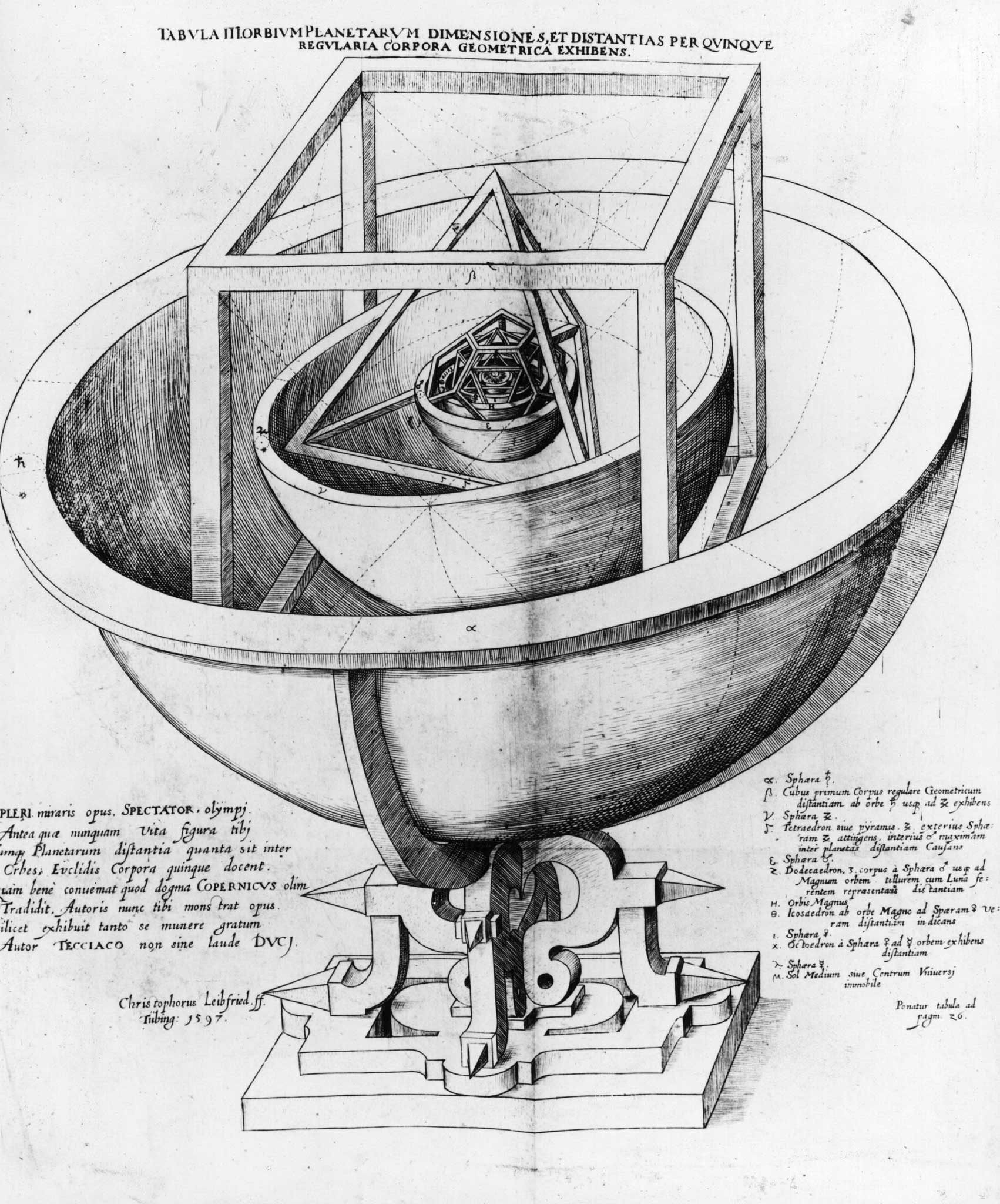 Kepler a tökéletes harmóniát kereste a világban, ennek jegyében megpróbálta megmagyarázni, hogy a bolygók miért keringenek közelebbi illetve távolabbi páyákon, mind a ptolemaioszi, mind a kopernikuszi modellben. Vajon mi alapján akkorák a bolygók pályái, amekkorák? Elképzelése szerint a sorban szorosan egymás köré tehető öt tökéletes (más néven szabályos) test (melyek egyféle, szabályos síkidomokkal határolt térbeli testek: tetraéder, kocka, oktaéder, dedokaéder, ikozaéder) egymásutánjai szabják meg a pályák méreteit. Kepler a saját "tökéletes" világmodelljét így ábrázolta: