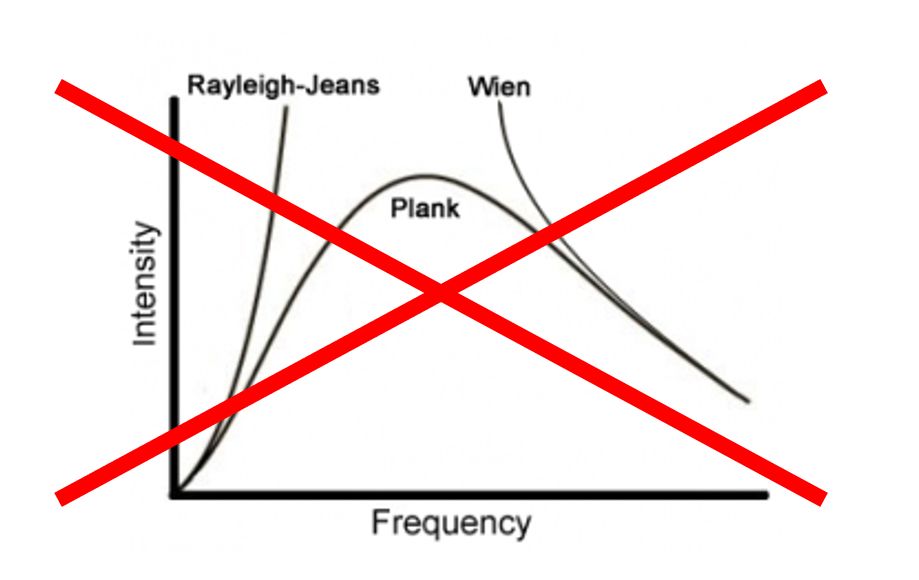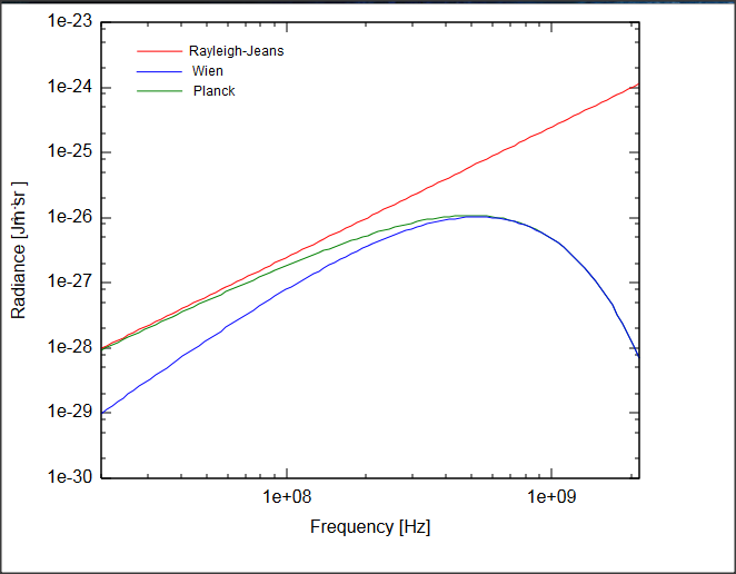 Tehát a Rayleigh-Jeans-törvény csak kis frekvenciákon (nagy hullámhosszokon) jó, máshol teljesen rossz. A Wien-féle formula frekvenciafüggése azonban minden frekvenciatartományban meglehetősen jó; csak kicsit tér el a mérésektől, melyekr a Planck-féle formula tökéletesen ileszkedik. A kis eltérést jobban láthatóvá tehetjük, ha a skálák logaritmikusak: