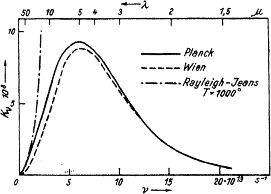 Azonban az \(\displaystyle F\left(\frac{f}{T}\right)\) függvényt továbbra sem sikerült elméleti úton levezetni, így az \(u(f,\ T)\) függvényről csak (nem könnyű) mérésekkel lehetett ismeretekhez jutni. Mivel a különféle frekvenciatartományok eltérő műszereket igénelnek, így a teljes függvénynek egyszerre mindig csak valamely kisebb tartományát lehetett kimérni.