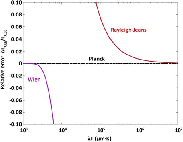 Ennek szemléltetésére szolgál, ha a vízszintes tengelyre nem a hullűmhosszot vagy a frekvenciát, hanem a \(\lambda \cdot T\) mennyiséget (a hullámhossz és a hőmérséklet szorzatát) tesszük (szintén logaritmikus skálán), a függőleges tengelyre pedig a relatív ("százalékos") eltérést a mért értékektől. Ilyenkor valóban az adódik, hogy a Wien-törvény csak alacsony hullámhosszokon (nagy fekvenciákon) jó, a Rayleigh-Jeans-törvény pedig csak nagy hullámhosszokon (alacsony frekvenciákon).
