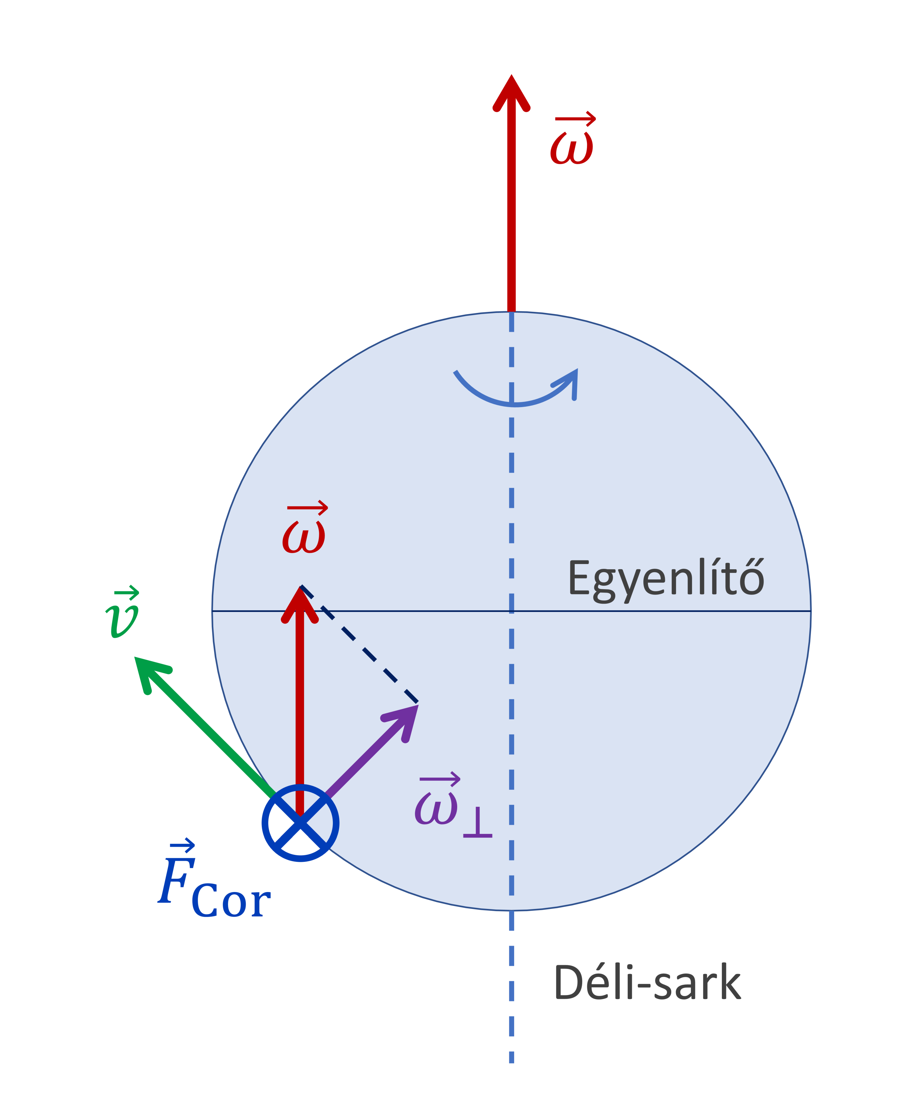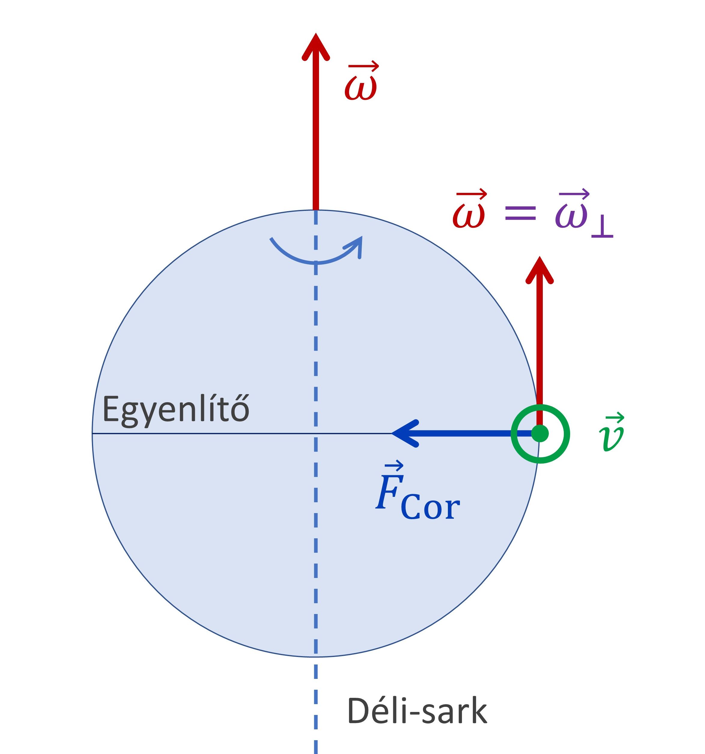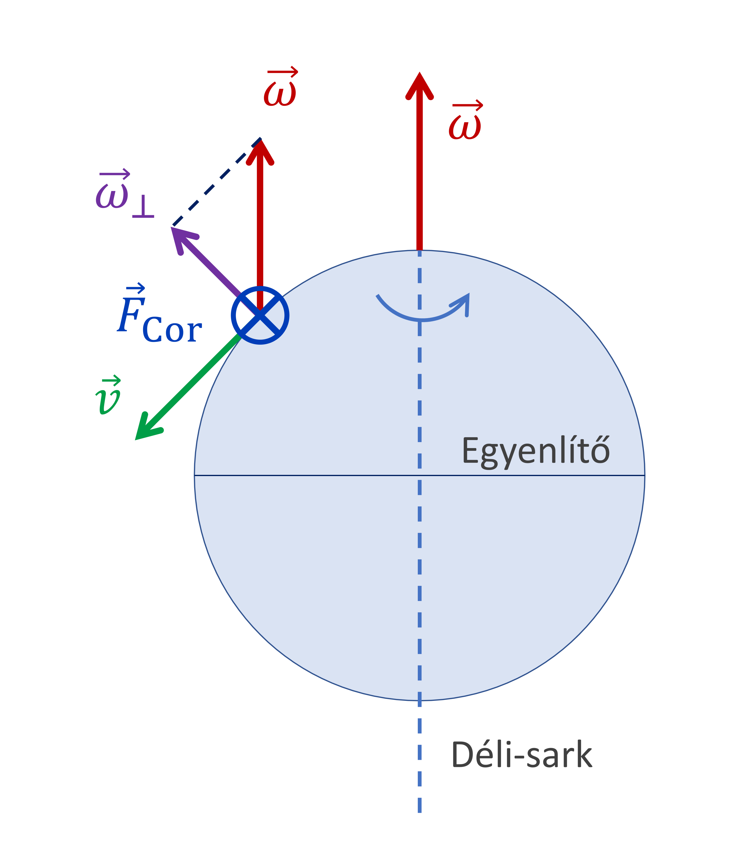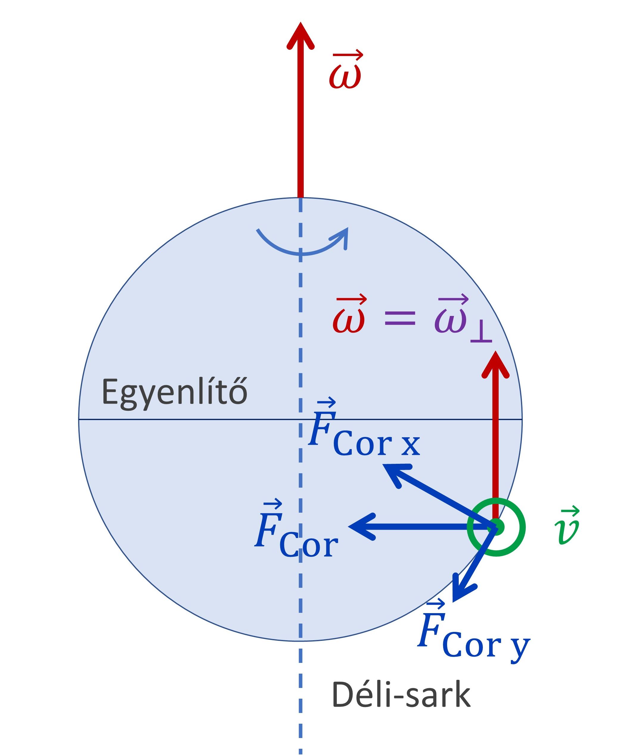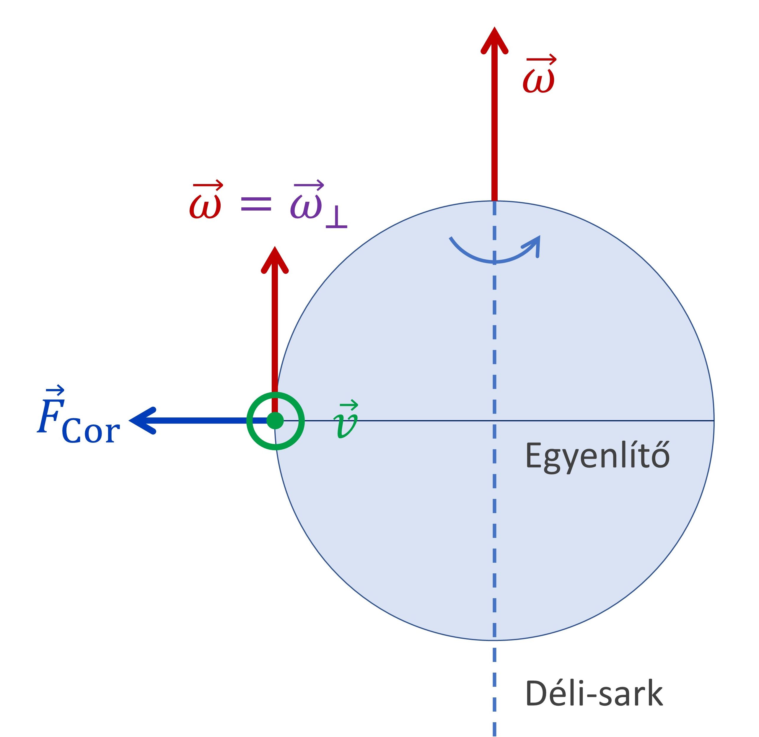 Ilyenkor a Coriolis-erőnek lesz egy vízszintesen déli irányba ható komponense, és egy függőlegesen lefelé ható komponense: